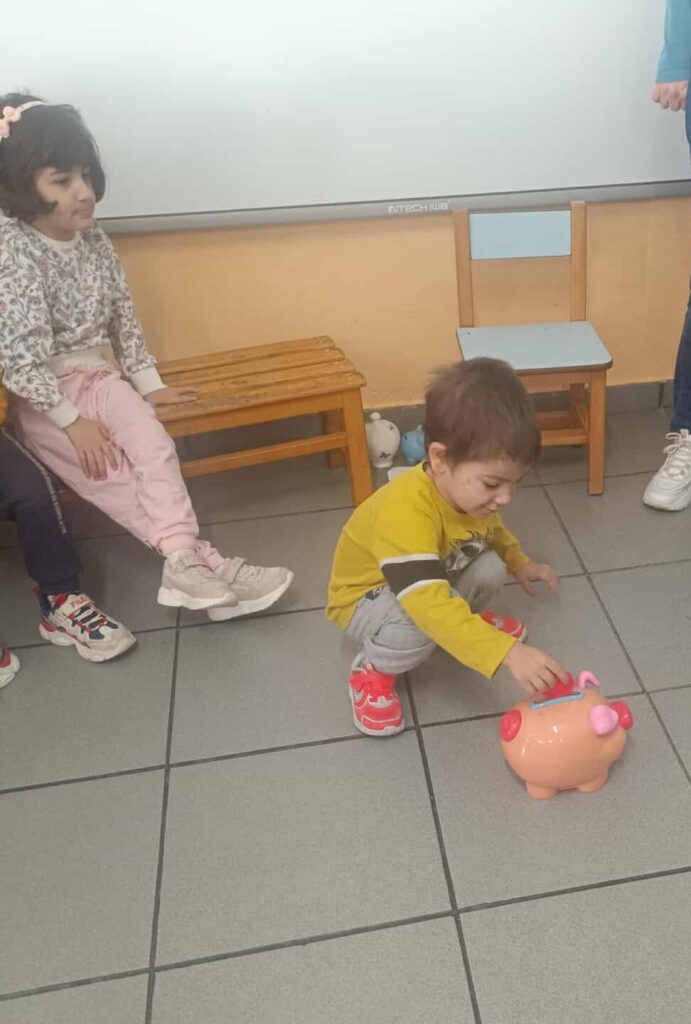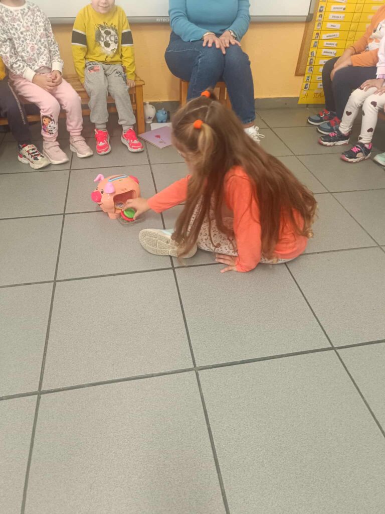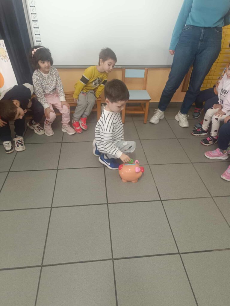 Παρατηρούμε έναν άδειο κουμπαρά. Ρίχνουμε από ενα κέρμα κάθε φορά και όταν τον ανοίγουμε μετράμε πόσα πολλά κέρματα έχουμε μαζέψει και χαιρόμαστε