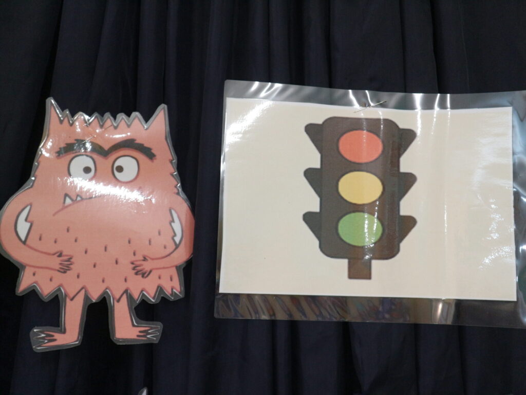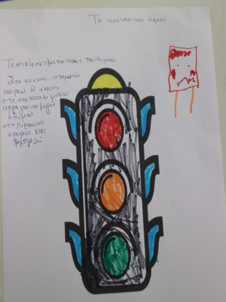 (Χτυπώντας παλαμάκια) – <Κόκκινο φανάρι σταματώ, παίρνω ανάσα, μετρώ ως τα δυο. Πορτοκαλί, φυσάω αργά, ο θυμός μου φεύγει μακρυά. Πράσινο φανάρι, χαμογελώ, ήρεμος τώρα προχωρώ.>