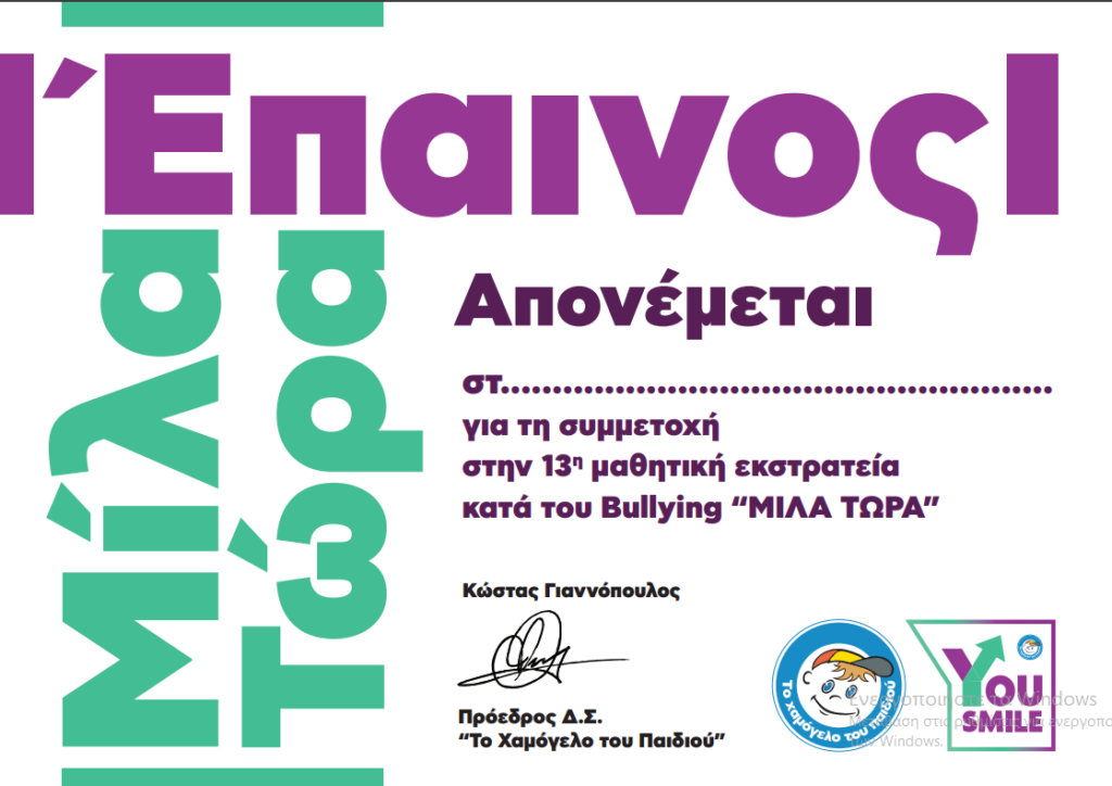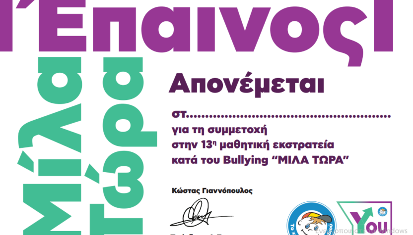 Επαινος συμμετοχής Από 11ο Νηπιαγωγείο ΧίουΣτις 21 Απριλίου, 2026Κατηγορία ΑΕΙΦΟΡΟ ΣΧΟΛΕΙΟ, Ενδυνάμωση. Συνεργασία. Αποδοχή.Προλαβαίνουμε τη Βία πριν εμφανιστεί» Προβολές: 0