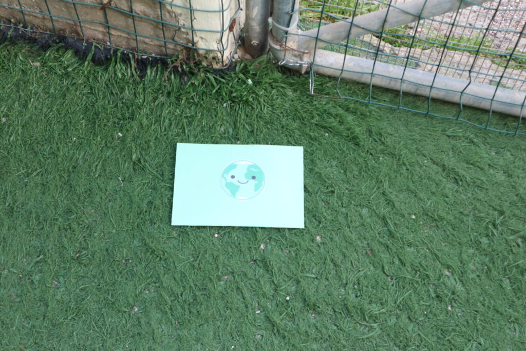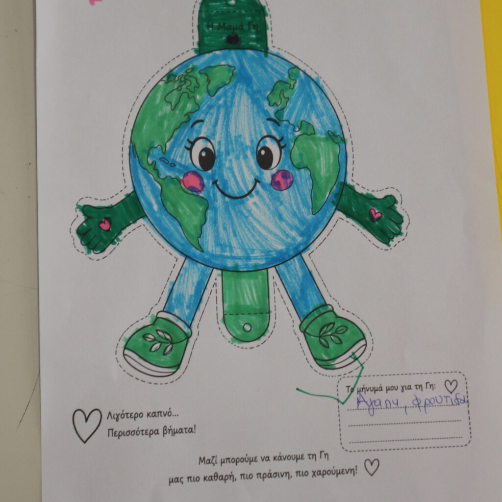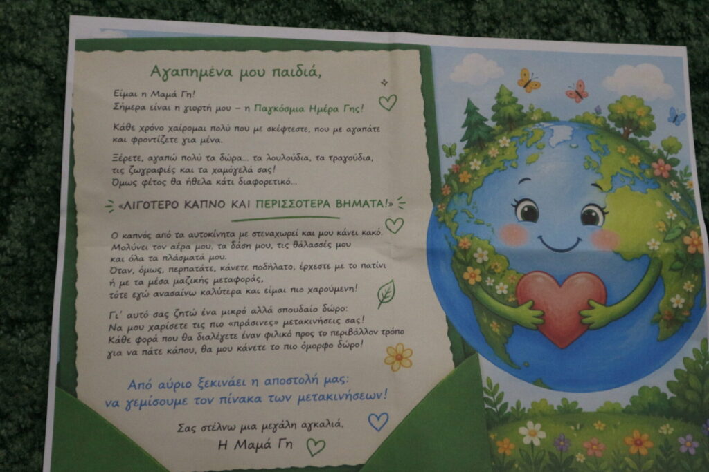 - Εμφανίζετε στην τάξη έναν μεγάλο, πράσινο φάκελο που γράφει απέξω “Προς τους Μικρούς Πράσινους Ταξιδιώτες”. Μέσα υπάρχει ένα γράμμα από τη “Μαμά Γη”. Η Γη λέει στα παιδιά ότι σήμερα είναι η γιορτή της και παρόλο που αγαπάει τα δώρα, φέτος θέλει κάτι διαφορετικό: «Λιγότερο καπνό και περισσότερα βήματα!».