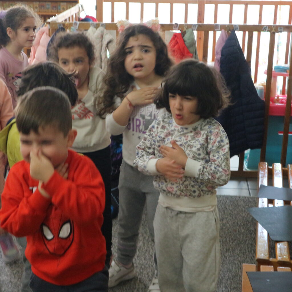Μια άλλα ομάδα παιδιών παριστάνει το “Ανθρώπινο Λεωφορείο. Γινονται όλα μαζί ένα μεγάλο λεωφορείο με οδηγό και επιβάτες Μαθαίνουν ότι ένα μεγάλο όχημα μεταφέρει πολλούς ανθρώπους και γλιτώνει πολλά μικρά αυτοκίνητα και μειώνει τα καυσαέρια