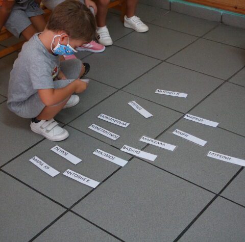 Τα παιδιά αναζητούν τη καρτέλα με το όνομα τους και την τοποθετούν δίπλα στη φωτογραφία τους. Γράφουν το όνομα τους και το στολίζουν με το δικό τους προσωπικό τρόπο. Βρίσκουν το αρχικό γραμματάκι του ονόματος τους, το φωνάζουν και στη …