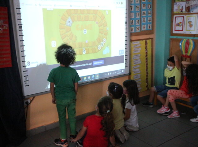 Τα παιδιά παίζουν δτον διαδραστικό ένα ψηφιακό παιχνίδι που έχουν δημιουργήσει τα ίδια με την νηπιαγωγό τους με το ψηφιακό εργαλείο genia.ly Το παιχνίδι έχει αξιολογικό χαρακτήρα