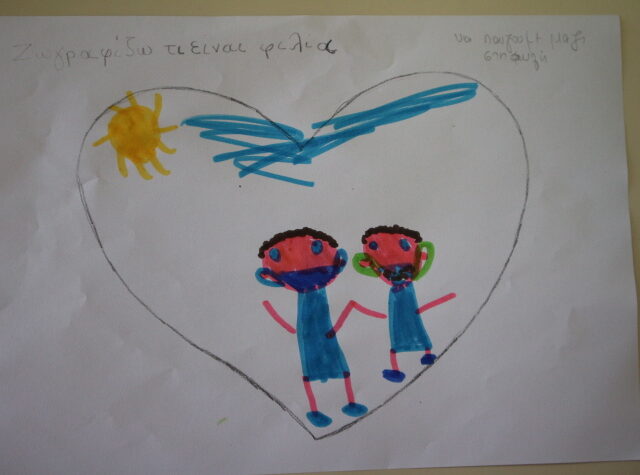 Και τα δυο τμήματα δημιουργούν την δική τους αφίσα, της φιλίας. Ονομάζουν την ομάδα τους: <Φίλοι για πάντα> και αποφασίζουν το δικό τους σύνθημᴨ¨¨¨¨¨¨¨¨¨¨¨: <Όλοι μαζί, φίλοι καλοί, όλοι μαζί πιο δυνατοί> Επιλέγουν ένα φίλο τους και χορεύουν ζευγαράκια΄ με …